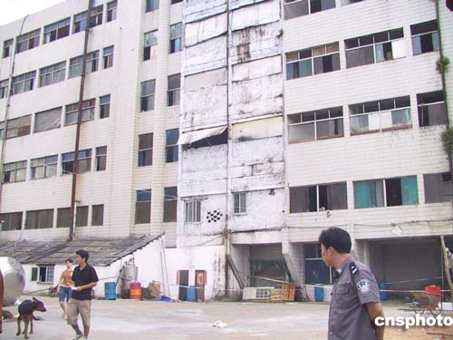 經(jīng)公安人員同意,記者獲準在工廠院門前拍照。剛端起相機,一條棕褐色大狼狗沖著記者大吠。而在另一幢樓門前,另一條狼狗正虎視耽耽盯著記者。這兩條大狼狗并沒有繩索牽絆,行動自如。一位紅腫著雙眼的女孩聞聲走到門前,欲關(guān)門拒絕記者拍照。