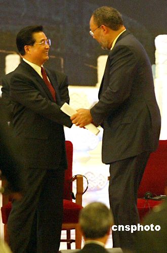 五月十六日晚,二○○五北京《財富》全球論壇在北京人民大會堂開幕,中國國家主席胡錦濤出席開幕式并作主題演講。圖為胡錦濤在演講結(jié)束后與大會主持人、時代華納公司董事長理查德·帕森里握手致意。作者:廖文靜