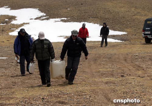 隊(duì)員野外取水并將大桶飲用水運(yùn)送上車(chē)(圖)