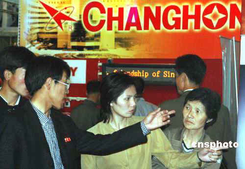 由朝鮮貿(mào)易省主辦的“第八屆平壤國(guó)際商品博覽會(huì)”五月十六日至十九日在朝鮮平壤三大革命展示館舉行,有來自世界各國(guó)的三百多家企業(yè)參展,這是朝鮮歷史上首次舉辦大規(guī)模的國(guó)際商務(wù)活動(dòng)。圖為朝鮮觀眾參觀中國(guó)長(zhǎng)虹電視展臺(tái)。作者:涵喬
