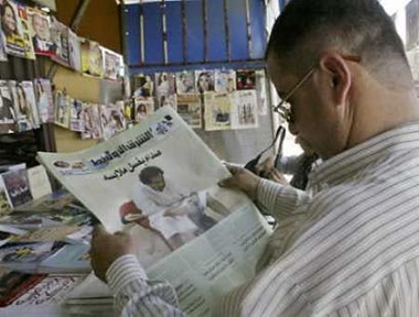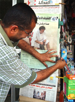 5月21日的英國(guó)《太陽報(bào)》再次刊登了薩達(dá)姆在獄中的照片,圖為伊拉克的報(bào)亭出售刊有相關(guān)圖片的報(bào)紙。 (春風(fēng))
