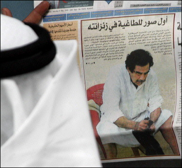 20日出版的英國太陽報曝光了幾張伊拉克前總統(tǒng)薩達(dá)姆·侯賽因在關(guān)押期間的照片。圖為一名科威特人在閱讀當(dāng)?shù)貓蠹堫^版上薩達(dá)姆洗衣服的照片。(春風(fēng))