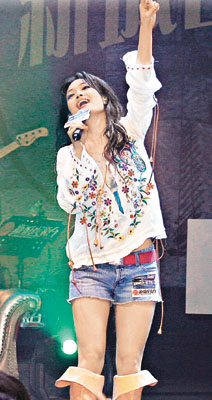 中新網(wǎng)5月23日電 據(jù)香港媒體報(bào)道,容祖兒和張信哲前晚在會(huì)展合作舉行《新城容我信愛一唱傾情音樂會(huì)》,祖兒身穿熱褲透視衫露黑bra大秀性感。開場時(shí)兩人合唱多首歌曲,令觀眾拍爛手掌,祖兒一時(shí)忘形說:“多謝張信哲給我的音樂會(huì)做特別嘉賓,我好少同帥哥合作!笔潞笞鎯禾寡砸蛱o張才說錯(cuò),她說:“其實(shí)我是想講拍檔!倍⒄艽蠓秸f:“無所謂,很久沒跟美女合作了!