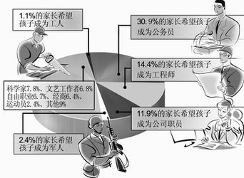 但調(diào)查同時(shí)顯示,家長對孩子未來期望過高。近三分之一的父母希望自己的孩子將來能夠成為公務(wù)員,只有1.1%的家長希望孩子成為工人(見圖1)。父母對孩子的希望一定程度上反映了當(dāng)今社會的一種價(jià)值取向。
