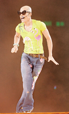 中新網(wǎng)6月1日電 據(jù)香港媒體報(bào)道,郭富城(城城)的神秘演唱會(huì)舞臺(tái)造型,在昨晚的“郭富城舞臺(tái)寶典@飛越舞林演唱會(huì)2005二部曲”揭曉,原來(lái)城城鏟了一個(gè)光頭,而且頭部畫(huà)了一只小鳥(niǎo)。城城這個(gè)突破性造型,令全場(chǎng)觀(guān)眾尖叫達(dá)數(shù)分鐘之多,極為震撼。