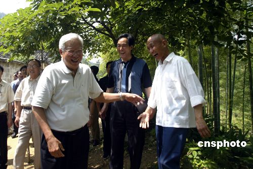 | 六月四日,全國政協(xié)副主席、全國政協(xié)副主席、中國致公黨中央主席羅豪才,率領(lǐng)致公黨中央的部分領(lǐng)導(dǎo)和一大批專家學(xué)者、實業(yè)家,由中共中央統(tǒng)戰(zhàn)部副部長黃躍金以及當(dāng)?shù)仡I(lǐng)導(dǎo)的陪同下,到安徽省安慶市潛山縣茶莊村進(jìn)行大別山區(qū)扶貧調(diào)研。圖為羅豪才(左)與當(dāng)?shù)卮迕裥φ劽撠氈赂灰约稗r(nóng)村果樹種植。作者:盛佳鵬