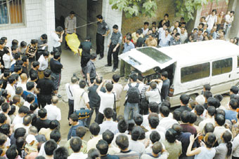 13時10分,記者從遠(yuǎn)處看到,那名劫持人質(zhì)的男子從2樓的窗戶里探出頭張望。13時14分,一個身穿灰黑色短袖、土黃色中褲的身影從居民樓2樓距地面約4.5米的窗口凌空落下,落地時伴隨著一聲凄厲的女聲尖叫。人群“嘩”地往上擁,附近的3名男子馬上上前抬起落地女子,欲送往等候多時的120急救車上。幾乎就在同時,突然從民房內(nèi)傳出4聲沉悶的槍響,一直在一旁等待的人質(zhì)父母雙雙昏厥。周圍的群眾有人大喊,有人鼓掌,大家都猜測到劫匪已經(jīng)死了。在場所有媒體的記者也試圖拍攝下女子被送進(jìn)救護(hù)車的鏡頭,但遭到公安人員與部分村民的強(qiáng)行制止。