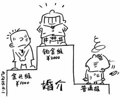 最近,南京出現(xiàn)一家“貴族婚介”,這家機構(gòu)將會員分成三個級別。首先是鉑金級,要求男性月收入在5000元以上,身高在1.75米以上,學(xué)歷本科以上,相貌端正談吐得體;女性月收入在3000元以上,身高在1.65米以上,學(xué)歷本科以上,漂亮。這個級別的會員年費為2000元。其次是金卡,要求男性月收入在3000元,身高難1.72米,本科;女性月收入1500元,身高1.62米,大專。這個級別的年費是1000元。最后是普通止背,不管男女,只要求收入在1000以上。按照規(guī)則,“上級”會員可以查看并約見“平級”和“下級”會員,“下級”會員去不能約見“上級”會員。這家“貴族婚介”的人員介紹,他們之所以將會員分級,目的只是想提高成功率!拔覀儾⒉皇亲璧K自由戀愛,但既然大家求助于婚介,借助一些社會上的潛規(guī)則有利于提高成功率!