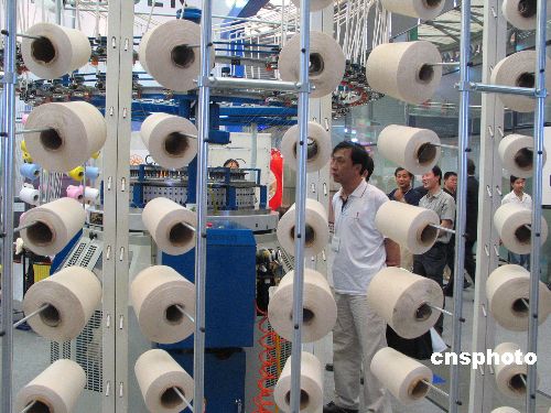| 6月4日,國務院副總理吳儀在北京會見了來訪的美國商務部長古鐵雷斯,就共同關(guān)心的中美經(jīng)貿(mào)關(guān)系問題坦誠、深入地交換了意見。吳儀說,紡織品問題是中美經(jīng)貿(mào)關(guān)系發(fā)展中面臨的一個重大問題,如處理不好,將嚴重影響雙邊經(jīng)貿(mào)合作進程,中方對此表示高度關(guān)注。圖為中國某紡織企業(yè)生產(chǎn)車間。作者:吳芒子