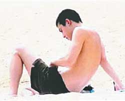講完電話,他又做了快40分鐘的日光浴,才突然坐起身,出人意表地拉開(kāi)短褲公然抓癢,可能是被螞蟻偷襲的關(guān)系。這一幕煽情又曖昧的畫(huà)面,就在海灘上活生生地上演,全被該媒體的狗仔隊(duì)給拍到了,讓陳冠希今年受人矚目的丑事,活生生再添一樁。