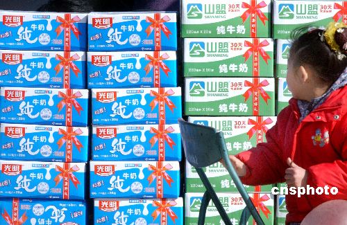 | 河南媒體近日報道了鄭州光明山盟乳業(yè)有限公司“變質(zhì)光明牛奶返廠加工再銷售”一事。對此,鄭州光明山盟的控股方——光明乳業(yè)股份有限公司當(dāng)日發(fā)布了“誠告消費者書”,稱“鄭州光明山盟從來沒有做過‘將變質(zhì)牛奶返廠加工再銷售’的行為”,但也坦承光明在管理上存在疏漏。圖為2005年3月13日鄭州街頭促銷的光明純牛奶和光明山盟純牛奶。作者:馬健