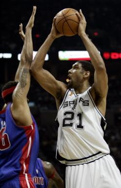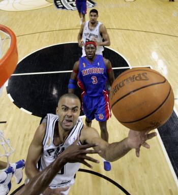 今年的總決賽,比賽雙方分別是2003年的總冠軍馬刺和2004年的總冠軍活塞。這也是兩支防守出色的球隊(duì)。剛剛打完?yáng)|部決賽第七場(chǎng)的活塞隊(duì)更早進(jìn)入狀態(tài),第一節(jié)比賽開(kāi)始后,活塞隊(duì)反客為主,在比賽中很快就占據(jù)上風(fēng),在連得6分后以9-4領(lǐng)先馬刺。此后,活塞隊(duì)繼續(xù)擴(kuò)大戰(zhàn)果,將領(lǐng)先優(yōu)勢(shì)擴(kuò)大到10分以上。不過(guò)此后漸漸找回感覺(jué)的馬刺隊(duì)展開(kāi)反擊,回贈(zèng)了一個(gè)7-2的小高潮,將比分差距縮小。第一節(jié)比賽結(jié)束時(shí),活塞以20-17領(lǐng)先馬刺。