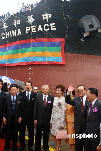 臺(tái)灣船東直接在祖國大陸訂造的第一艘船“中華和平”號(hào)十日在滬舉行盛大的命名交船儀式,圖為全國政協(xié)副主席董建華、中國國民黨主席連戰(zhàn)夫人連方瑀女士等專程趕來見證海峽兩岸這一重要的歷史性時(shí)刻,并在“中華和平”號(hào)前合影留念。作者:孫自法