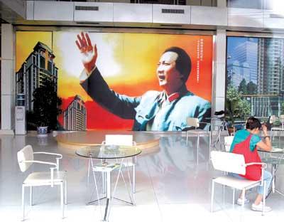 北京市朝陽區(qū)楊閘環(huán)島附近的一個(gè)售樓處,毛主席揮手的大幅廣告赫然掛在該售樓處的玻璃幕墻內(nèi)。該廣告由兩部分組成,左下角是幾個(gè)住宅樓的圖片,毛主席揮手的照片占用了三分之二的畫面。