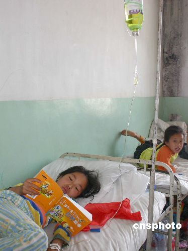截至六月十四日,在黑龍江沙蘭鎮(zhèn)洪災(zāi)中受傷入院的十七名學生已基本康復(fù)。圖為一名學生邊輸液邊閱讀故事書。作者:吳兆飛