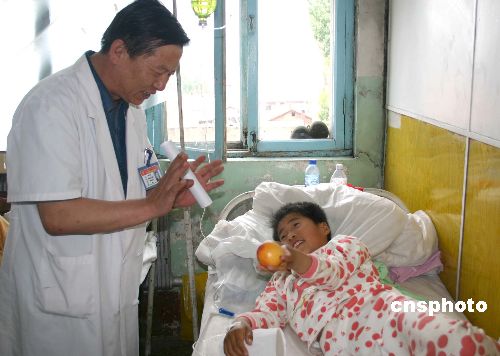 截至六月十四日,在黑龍江寧安特大山洪災(zāi)害中被救出的十七名學(xué)生已基本康復(fù)。但學(xué)生心中仍存恐懼與陰影,為此醫(yī)生通過(guò)聊天、玩游戲等方式對(duì)學(xué)生進(jìn)行心理疏導(dǎo)。圖為一名學(xué)生聽(tīng)完專家的笑話,高興地將蘋(píng)果送給專家。作者:吳兆飛