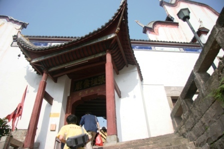 筆者一行自云陽新城的南岸驅(qū)舟,橫穿長江抵達南岸的張飛廟碼頭。船行長江,江上風清日烈。談笑間,舟已至南岸。棄舟登岸,拾階而上。路陡且窄,兩邊多仿古店肆,店家小販叫賣不斷。烈日如炙,同行者皆汗流夾背。
