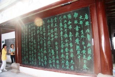 廟內(nèi)現(xiàn)存石碑和摩崖石刻及木刻書畫多達數(shù)百幅,書畫作品遠自漢唐近至明清各代,名家薈萃,實為罕見。其中以木刻顏真卿書《爭座位帖》;石刻蘇軾作前、后《赤壁賦》大字長卷;石刻岳飛書諸葛亮前、后《出師表》;黃庭堅書《唐韓伯庸幽蘭賦》;鄭板橋書寫的詩文和竹石、蘭石繪畫等最為著名。此外還有劉墉、張船山、竹禪、彭聚星龔睛碑、趙熙、郭尚元、張潮庸、劉貞安等人的木刻字畫,琳瑯滿目,美不勝收。