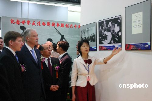 六月十八日,俄羅斯國(guó)家杜馬主席格雷茲洛夫出席了重慶市直轄八周年紀(jì)念活動(dòng)和《紀(jì)念二戰(zhàn)勝利六十周年圖片展》開幕式。圖為重慶中國(guó)三峽博物館《紀(jì)念二戰(zhàn)勝利六十周年圖片展》展廳內(nèi),格雷茲洛夫(左二)認(rèn)真傾聽講解員解說。作者:郭晉嘉