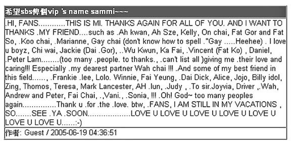 其實自Sammi接拍《長恨歌》以來,關于其身體及精神狀況的傳聞一直沒完沒了,曾志偉早前透露梅艷芳的逝世對她打擊很大,更有意退出娛樂圈。不過,Sammi為安撫歌迷,曾化名“Mi”以英文在網上留言,表示自己身體很好。剛過去的星期天,她更兩度在網上留言,除了祝愿天下父親“父親節(jié)快樂”外,更于凌晨時分留言答謝一眾好友,當中包括安仔、古天樂、古巨基、陳慧琳及劉德華等,可見Sammi與安仔關系依然要好。