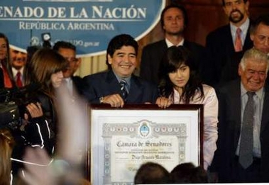 中新網(wǎng)6月22日電 走在紅地毯上,在眾多知名政客的簇擁下,阿根廷球星馬拉多納從阿根廷副總統(tǒng)兼參議院議長肖利手里接受了國會榮譽勛章。
