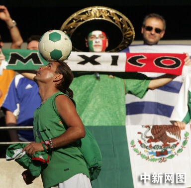 2005年6月22日,德國法蘭克福體育場(chǎng),在聯(lián)合會(huì)杯足球賽墨西哥與希臘比賽開始之前的墨西哥球迷為自己球隊(duì)加油。