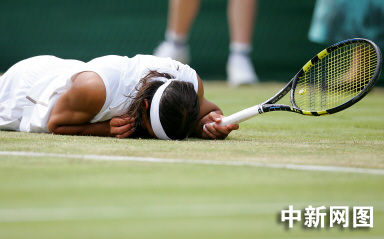 2005年6月23日,第119屆溫布爾登網(wǎng)球錦標(biāo)賽上,西班牙選手納達(dá)爾痛苦的躺在網(wǎng)球場上,他在第二輪對戰(zhàn)盧森堡選手穆勒時痛失一分。