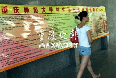 重慶師范大學學生處張老師介紹,《管理規(guī)定》是嚴格遵守重慶市教委《高等學校制定和修改學生管理制度》中第四十二條“有損大學生形象、有損社會公德”的精神來修訂的,于5月22日正式試行,6月中旬制成展板,放到學生出入較多的一教樓,希望學生發(fā)表自己的看法。但是,直到昨日,沒有一個學生到學生處反饋意見。