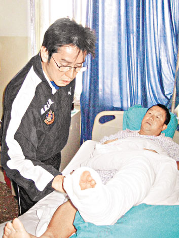 “香港明星足球隊”前日與“中國明星足球隊”于北京進行友誼賽,結(jié)果落敗之余,志偉及張兆輝更受傷收場,志偉被對方隊員踢中左腳,痛得未能站起來,最后要用擔(dān)架抬離現(xiàn)場,隨即送院治理,經(jīng)醫(yī)生診斷后需馬上進行手術(shù),幸好一切順利,據(jù)其主診醫(yī)生透露,志偉傷勢并不嚴重,大約休息七天,待完全康復(fù)后更可繼續(xù)踢球。