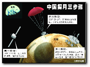 2004年2月,國防科學(xué)工業(yè)委員會領(lǐng)導(dǎo)對外宣稱:中國月球探測計(jì)劃已經(jīng)進(jìn)入實(shí)施階段,將分“繞”、“落”、“回”三步。