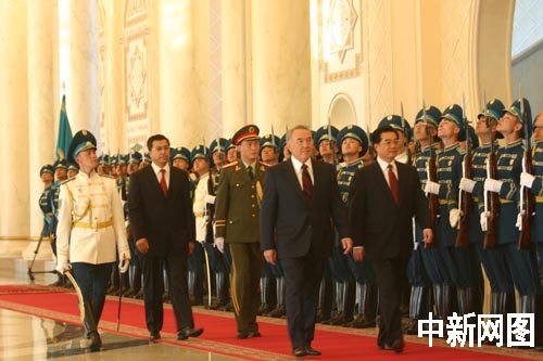 當地時間七月三日傍晚,哈薩克斯坦總統(tǒng)納扎爾巴耶夫在總統(tǒng)府舉行隆重的歡迎儀式,歡迎到訪的中國國家主席胡錦濤。