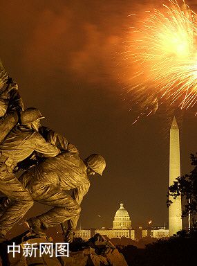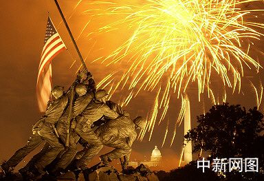 7月4日,圖為在美國費(fèi)吉尼亞州阿林頓國家公墓的美國海軍陸戰(zhàn)隊(duì)紀(jì)念碑上空,紀(jì)念美國獨(dú)立日的煙火表演照亮夜空。