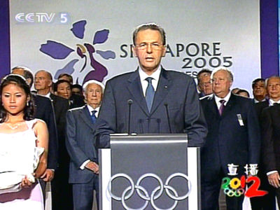 主辦城市選舉的懸念留到了最后一輪,由倫敦“決斗”同樣強大的巴黎。在這輪的投票選舉中,雙方?jīng)]有讓國際奧委會主席羅格難堪的戰(zhàn)成平手,而是高下立分。在經(jīng)過一段讓人幾乎窒息的等待之后,一位華裔新加坡女孩把放有結(jié)果的信交給了羅格。羅格在感謝了東道主新加坡民眾、此前提出申請的國家和五個候選國家后,向世人大聲宣布:國際奧委會決定,把第30屆奧運會的主辦權(quán)交給倫敦!