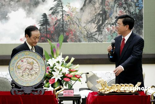 會見結(jié)束時,張德江向新黨大陸訪問團贈送了金漆木雕“龍舟”,寓意戮力同心、戰(zhàn)勝困難。新黨大陸訪問團贈送給廣東一件交趾燒“麒麟盤”,取麒麟對抗邪惡之意,據(jù)說這種陶器制作法源于廣東,后流傳至臺灣。