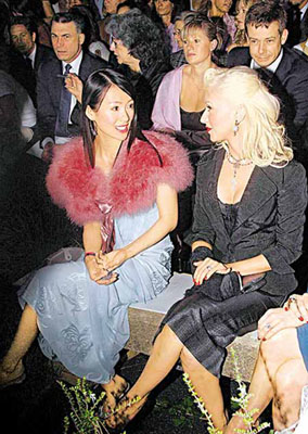 章子怡與一眾好萊塢女星坐第一排,風頭互不相讓。以Dior秋冬的搶眼紅皮草配粉藍裙的章子怡,與美國女歌手Christina Aguilera、搖滾歌手Maryiln Manson的未婚妻D(zhuǎn)ita Von Teese同坐,三人看秀時交談甚歡,有指她英文進步神速,看來此言非虛。而不遠處的金像影后查理茲-塞隆(Charlize Theron)穿黑色超短裙,非常性感,她更獲安排與LVMH老板娘同坐,地位超然。同場還有主演《霹靂嬌娃》的德魯·巴里摩爾(Drew Barrymore)。
