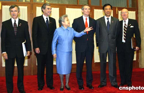 中國國務(wù)院副總理吳儀(左三)與美國商務(wù)部長古鐵雷斯(左一)、美國貿(mào)易代表波特曼(右一)、美國農(nóng)業(yè)部長約翰斯(右二)步入會場。作者:廖文靜