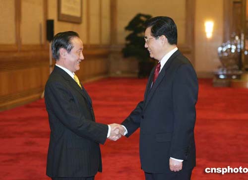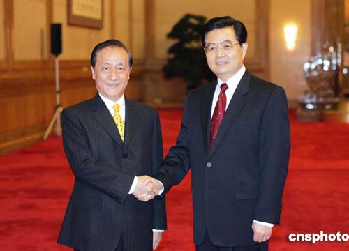 中共中央總書(shū)記胡錦濤7月12日在北京人民大會(huì)堂會(huì)見(jiàn)了臺(tái)灣新黨主席郁慕明率領(lǐng)的臺(tái)灣新黨“民族之旅”訪問(wèn)團(tuán)。作者:毛建軍