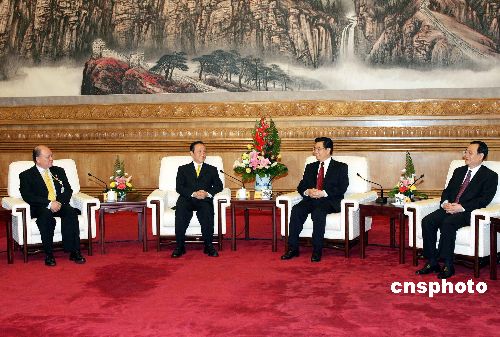 中共中央總書記胡錦濤七月十二日在北京人民大會(huì)堂會(huì)見臺(tái)灣新黨主席郁慕明率領(lǐng)的臺(tái)灣新黨“民族之旅”訪問團(tuán)。作者:毛建軍