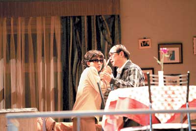 陶虹在全場(chǎng)最“正!钡拇虬绫闶堑谌齻(gè)中年婦女的角色,一頭規(guī)矩的黑發(fā),身穿土黃色的、式樣頗為土氣的套裙,手中拎的白色皮包也是極盡規(guī)矩。從首演效果來(lái)看,陶虹的三次“變身”還算成功,三個(gè)反差極大的人物造型給她的表演助了一臂之力。