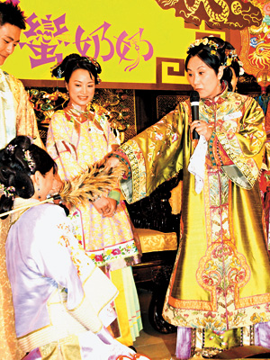 中新網(wǎng)7月13日電 據(jù)香港《大公報(bào)》報(bào)道,“無線”將于下周一推出新劇《我的野蠻奶奶》,昨日一班演員包括汪明荃、胡杏兒、黃宗澤及伍詠薇等,特地穿上清裝到珍寶海鮮舫舉行“新抱入門儀式”宣傳活動(dòng)。期間“阿姐”、杏兒及Bosco(黃宗澤)除了Rap唱主題曲之外,“阿姐”更如野蠻奶奶“上身”般,向杏兒訓(xùn)示媳婦入門家規(guī)時(shí)喝令她跪下,之后送杏兒繡花鞋、樹葉及雞毛掃,“阿姐”道:“送樹葉是希望你開枝散葉,我看你晚晚都沒空!倍觾阂膊皇呛闷圬(fù),斟茶時(shí)即對(duì)“阿姐”道:“小心嗆到!”
