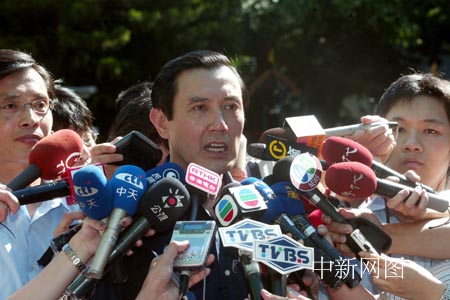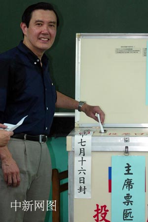 7月16日,中國國民黨主席選舉在全臺601個投票所展開。圖為1號參選人、臺北市長馬英九在居家附近的臺北興德小學參加投票。中新社記者 盛佳鵬