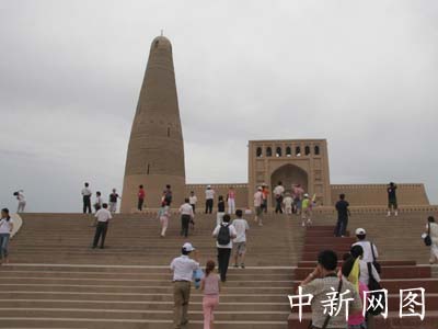位于吐魯番市東郊2公里處的木納格村,全國(guó)重點(diǎn)文物保護(hù)單位。蘇公塔,又名“額敏塔”,建成于1777年,是新疆現(xiàn)存最大的古塔,至今已有200多年的歷史。蘇公塔是清朝名將吐魯番郡王額敏和卓的次子蘇來(lái)曼,為紀(jì)念其父的功績(jī),表達(dá)對(duì)清王朝的忠誠(chéng),自出白銀7000兩建造而成的。蘇公塔高44米,基部直徑10米。塔身上小下大,呈圓錐形。塔中心有一立柱,呈螺旋形向上逐漸內(nèi)收直至塔頂,共有臺(tái)階72級(jí)。塔系磚木結(jié)構(gòu)。在不同方向和高度,留有14個(gè)窗口,塔身外部有幾何圖案15種之多,可謂精妙絕倫。蘇公塔造型別具一格,莊嚴(yán)、古樸,具有濃郁的伊斯蘭風(fēng)格,是吐魯番著名的旅游景點(diǎn)之一。1961年,蘇公塔經(jīng)歷了12級(jí)大風(fēng)的考驗(yàn),安然無(wú)恙。為了以防不測(cè),妥善保護(hù)古塔,目前在塔體外加了三道鐵箍固定它。