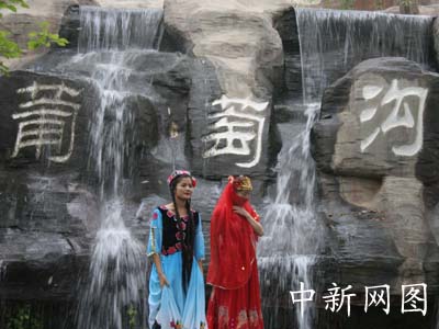 葡萄溝,位于吐魯番縣城東北角,是火焰山西側(cè)的一個(gè)峽谷。車進(jìn)峽谷,只見兩山夾峙,中間是草木芳菲的溝壑,宛如一道綠色的畫廊。吐魯番人在谷底筑了鵝卵石和水泥板砌成的河渠,長流不息的河水恰似一道銀練從溝底奔騰而下,翻卷著雪白的浪花縱貫二三十里,澆灌著整個(gè)葡萄溝。沿著河水向峽谷深處延伸的那層層疊疊的葡萄田,像一匹匹的翠綠的綢緞,依山勢直掛在柏油路兩旁的山坡上,其間桑榆桃柳,錯(cuò)落有致;村舍農(nóng)家周圍清流縈回。萬綠叢中,但見衣裙鮮艷的維吾爾少女,三五成群,手挽筐籃,活躍在葡萄園里,使葡萄溝更顯得斑斕多彩。她們的陣陣笑語歡歌,伴隨著潺潺水聲,嚶嚶鳥鳴,好像一支美妙的田園交響曲,令人陶醉留連。盡管此時(shí)火焰山下熱氣蒸騰,熾風(fēng)撲面,天上烘烤,地上烙腳,而葡萄溝里卻清風(fēng)習(xí)習(xí),涼爽宜人,真是風(fēng)光迷人的的避暑勝地。