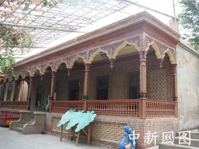 在葡萄溝較高的坡地上建有一種非常特殊的房屋,它的四壁都是用土坯疊砌,但在墻上密密匝匝布滿氣孔。較大的房屋約有兩層樓高,遠(yuǎn)望像個(gè)古城堡惹人矚目;置身跟前,又覺得它像養(yǎng)“蟈蟈”的方形巨籠,十分別致、奇特,這就是晾葡萄干的房子。這種房子,當(dāng)?shù)鼐S吾爾人稱作“群結(jié)”,漢語叫作“蔭房”。蔭房為葡萄溝旖旎誘人的風(fēng)光增添了奇異的色彩。蔭房里,屋頂上每隔半米左右架著一根碗口粗的“檁子”。