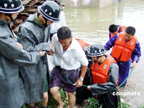 7月20日,邊防戰(zhàn)士們纏著繩索、拄著木棍、背著老人在齊腰深的水中艱難行走。受第5號強(qiáng)臺風(fēng)“海棠”影響,海島浙江省玉環(huán)縣境內(nèi)普降大暴雨,強(qiáng)降雨致使一些地方洪水泛濫。該縣大麥嶼村70多位村民被洪水圍困,情況緊急,正在附近搶險的武警玉環(huán)縣公安邊防大隊(duì)18位官兵及時趕到,戰(zhàn)士們利用繩索牽引,背著老人和孩子,在1米多深的洪水中最終將全村村民安全解救。作者:黃旭堂