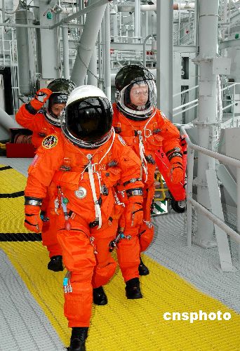 美國航天飛機“發(fā)現(xiàn)號”機組人員七月二十六日上午七時十九分抵達(dá)肯尼迪航天中心發(fā)射場,在發(fā)射架的白房間完成最后準(zhǔn)備后進入太空艙。(NASA供圖)作者:NASA