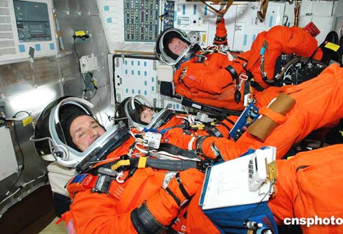 圖:美國“發(fā)現(xiàn)號(hào)”機(jī)組人員進(jìn)入太空艙里