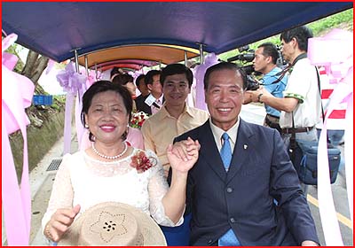 中新網(wǎng)8月1日電 據(jù)《中央日報》報道,“2005臺中縣兩馬觀光季”“喜事連連愛相隨幸福久久集體婚禮”昨天(31日)在臺中縣后豐鐵馬道9號隧道口的夫妻樹廣場舉行,臺中縣長黃仲生夫婦與縣“議會”副議長陳芳隆共同為24對新人福證,隨后新人們搭乘電動小火車暢游9號隧道及花梁鋼橋,與歷史共同做見證。