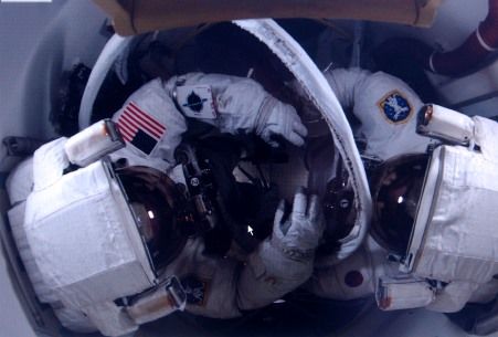 中新網(wǎng)洛杉磯八月一日電(記者 賈國榮)美國宇航局今天公布的最新太空圖片,展現(xiàn)太空中受傷的合金巨鳥----發(fā)現(xiàn)號航天飛機,和兩名宇航員完成第二次太空行走任務,回到艙位的奇特形象。