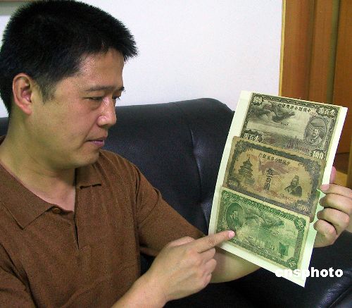 隨著抗日戰(zhàn)爭勝利60周年紀(jì)念日的臨近,湖南省收藏協(xié)會(huì)理事闞志雄先生8月4日向本社記者展示了自己十幾年收集的日偽政府貨幣。他說,從貨幣上看,當(dāng)時(shí)日本對華的經(jīng)濟(jì)掠奪“鐵證如山”。作者:李思之